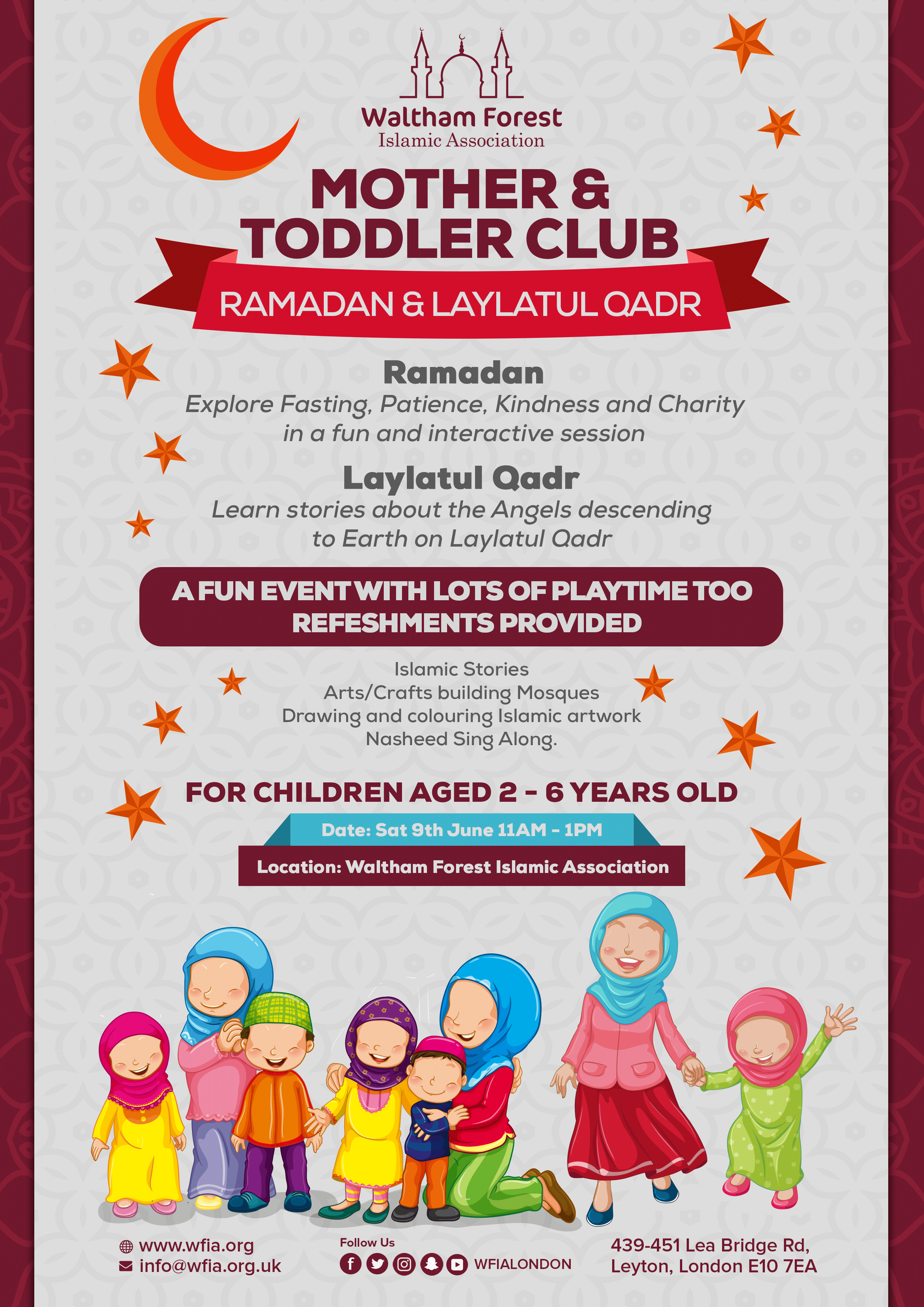 WFIA is launching a new Mother and Toddler Session starting with the topic on the blessed month of Ramadan please bring your children along to help instil the beautiful values of our deen whilst learning through play! Snacks and juices will be provided!